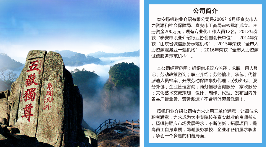泰安揚帆職業(yè)介紹有限公司是2009年9月經(jīng)泰安市人力資源和社會保障局、泰安市工商局審核批準成立。注冊資金200萬元,現(xiàn)有專業(yè)化工作人員12名。2012年榮獲“泰安市職業(yè)介紹行業(yè)協(xié)會副會長單位”;2014年榮獲“山東省誠信服務(wù)示范機構(gòu)”;2015年榮獲“全市人力資源服務(wù)業(yè)十強機構(gòu)”;2016年榮獲“全市人力資源誠信服務(wù)示范機構(gòu)”。